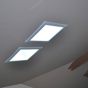 Ca și rezolvare am montat tunele solare SUNWAY 360 și SUNWAY 260 (L: 120 cm) dealungul holului (500 cm).